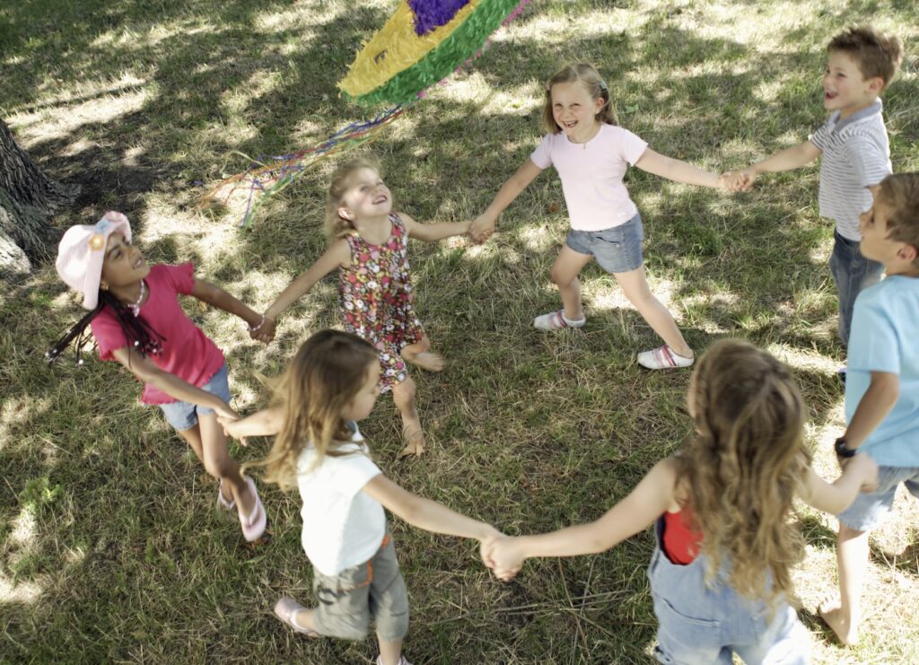 Çocuklar sopayı iki elleriyle yatay şekilde, bel hiz...