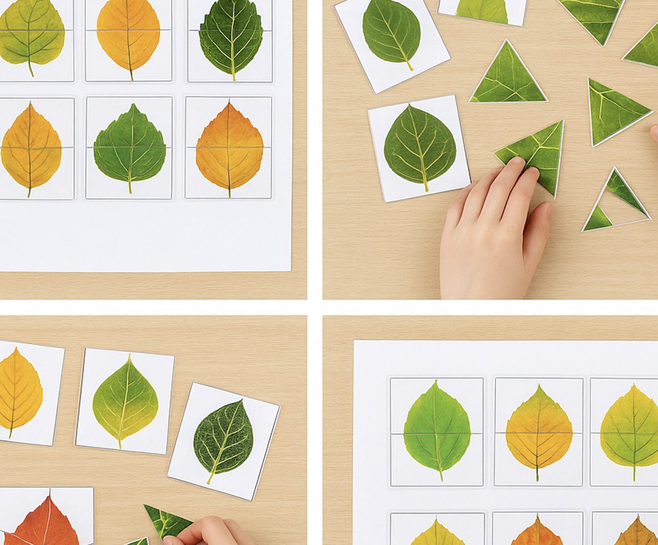 Öğretmen çocuklara “Bugün doğanın gizli parçalarını birleştireceğiz!” diyerek oyunu tanıtır. Çocuklarla yaprakların renk, şekil ve damar yapıları hakkında kısa bir sohbet yapılır. Her çocuğa ya da küçük gruplara bir yaprak zarfı verilir. Çocuklar parçaları inceleyip hangi parçaların birlikte olduğunu tahmin eder. Parçalar birleştirildikçe öğretmen yönlendirici sorular sorar: