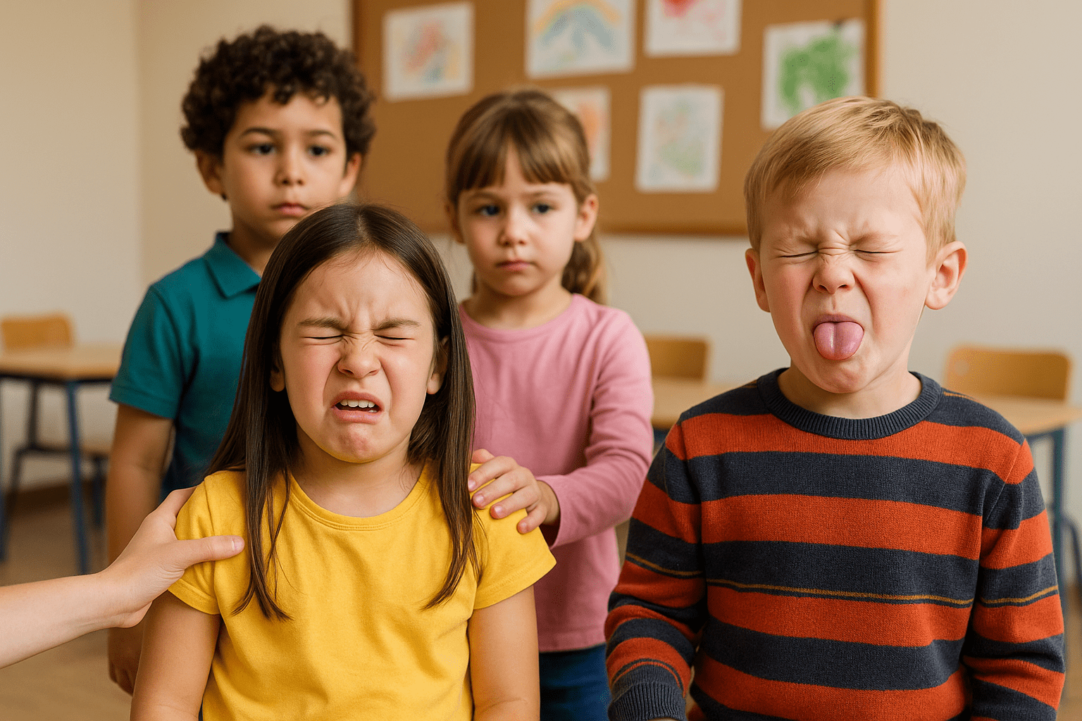 üm çocuklar seçtikleri yüz buruşturmayı iki kez prova eder, sonra herkes nötr bir yüz yapar ve sınıfa farklı noktalara dağılır. Kapı dışındaki iki çocuktan birini içeri çağırın. Oyuncu, hafıza oyunundaki gibi bir “kart açma” hamlesi yapar: Bir çocuğun omzuna hafifçe dokunur → çocuk yüzünü buruşturur.