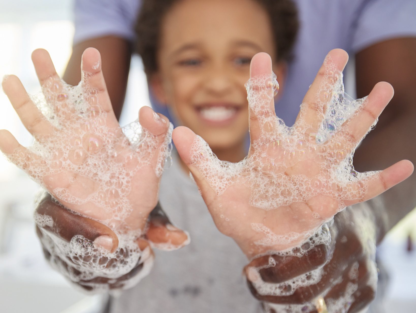 Çocuklar damlaların köpükten geçip suya karışmasını izler.