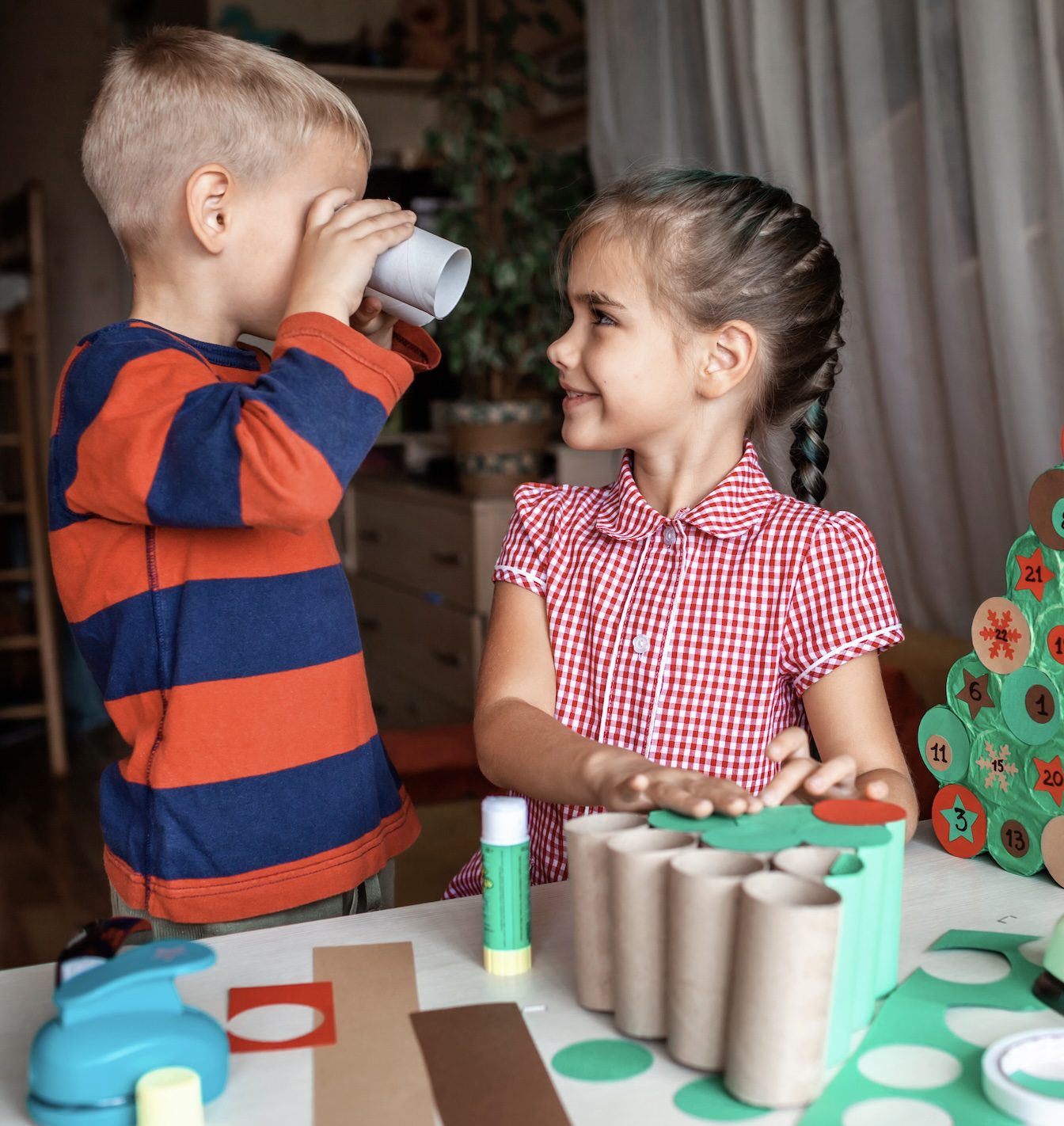 Karton ruloya yıldız şekil, verilir, yapıştırıcı bant ile şekil bozulmasın diye rulonun arka tarafından katlanan yerlerinden yapıştırılır, boya hazırlanır.