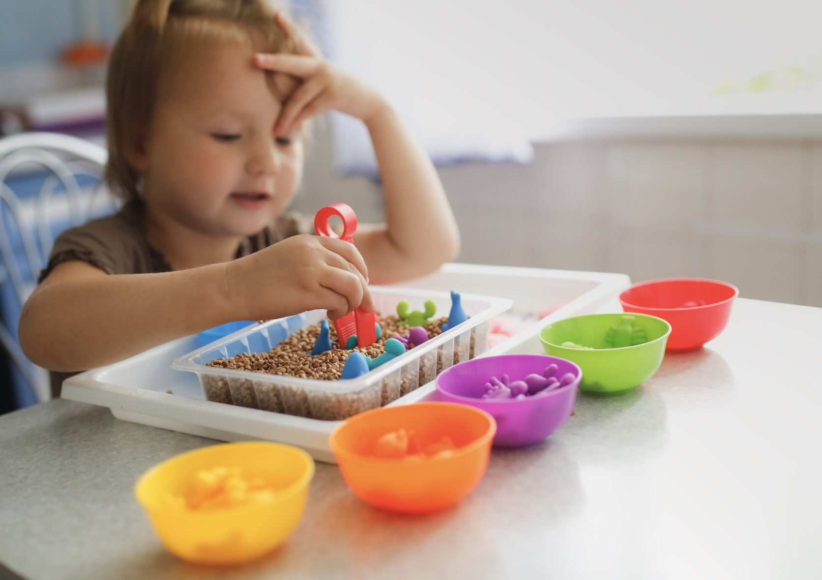 Çocuğa karışık tepsiyi göster ve “Bu malzemeleri ayırmaya ne dersin?” diyerek etkinliği başlat. Çocuk, malzemeleri tek tek ayırarak uygun renkteki kaselere yerleştirir: