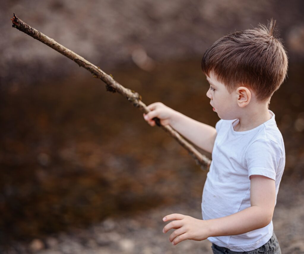Bir çocuk sopayı dik şekilde yere dayar ve üst kısmından tek eliyle tutar. Önce tek başına, sopanın ... Angebot ansehen